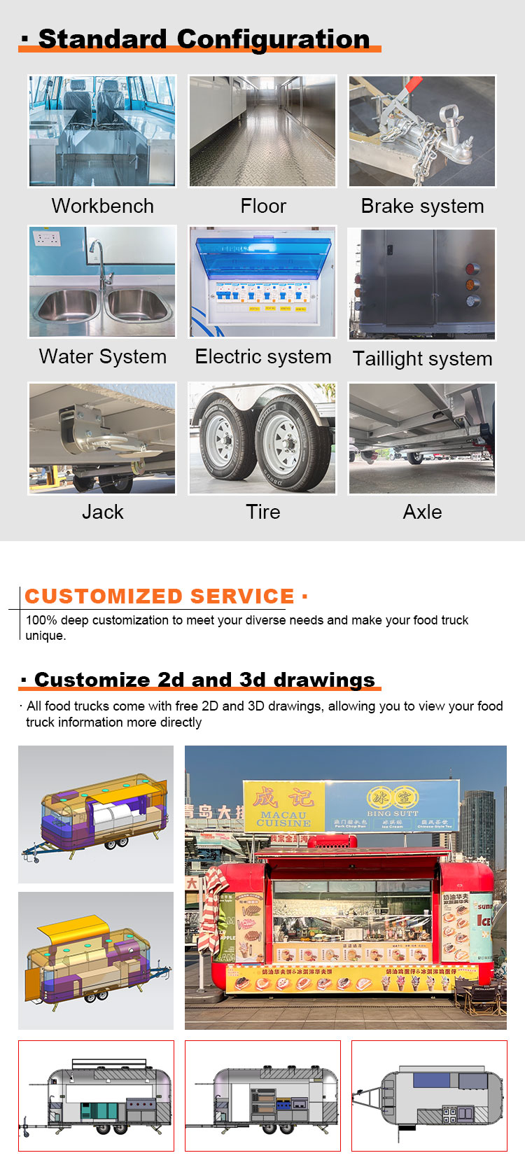 主材料には、耐食性と耐久性に優れ、さまざまな環境条件下でも安定した性能を維持できる高品質の304ステンレス鋼を採用し、当社のケータリングトレーラー製品は、長期にわたって優れた品質と機能を維持し、さまざまな課題に直面することができます。 304 ステンレス鋼の優れた耐食性により、トラックは酸化や錆びの影響を受けにくくなり、耐用年数が大幅に延長されます。 304 ステンレス鋼の優れた耐食性により、トラックは酸化や錆びにくくなり、耐用年数が大幅に延長されます。