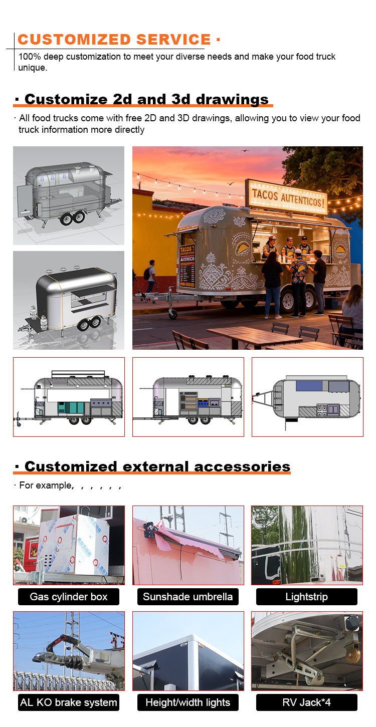 主材料には、耐食性と耐久性に優れ、さまざまな環境条件下でも安定した性能を維持できる高品質の304ステンレス鋼を採用し、当社のケータリングトレーラー製品は、長期にわたって優れた品質と機能を維持し、さまざまな課題に直面することができます。 304 ステンレス鋼の優れた耐食性により、トラックは酸化や錆びの影響を受けにくくなり、耐用年数が大幅に延長されます。 304 ステンレス鋼の優れた耐食性により、トラックは酸化や錆びにくくなり、耐用年数が大幅に延長されます。