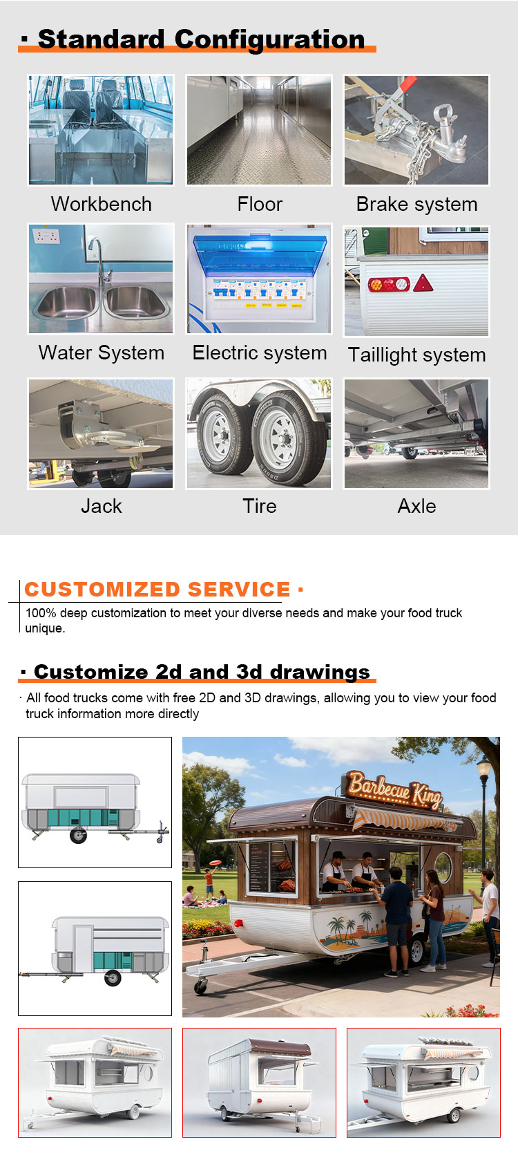 主材料には、耐食性と耐久性に優れ、さまざまな環境条件下でも安定した性能を維持できる高品質の304ステンレス鋼を採用し、当社のケータリングトレーラー製品は、長期にわたって優れた品質と機能を維持し、さまざまな課題に直面することができます。 304 ステンレス鋼の優れた耐食性により、トラックは酸化や錆びの影響を受けにくくなり、耐用年数が大幅に延長されます。 304 ステンレス鋼の優れた耐食性により、トラックは酸化や錆びにくくなり、耐用年数が大幅に延長されます。