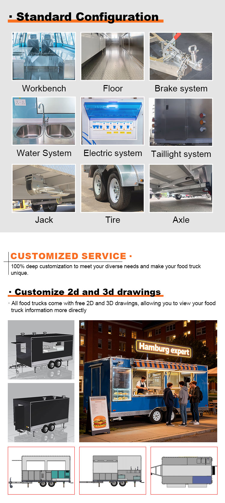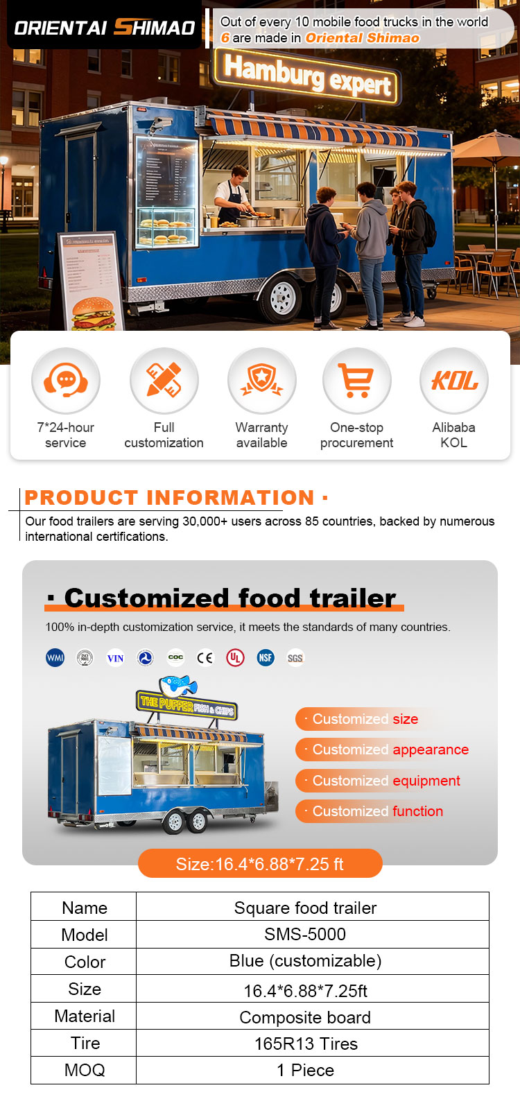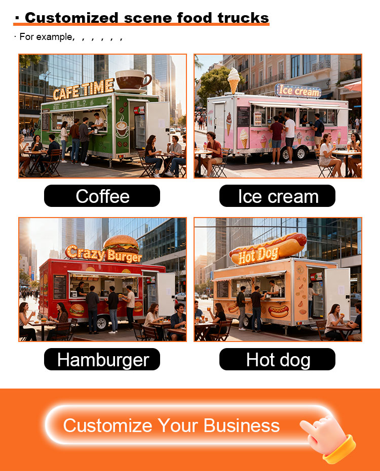 素材とプロセス:フードトラックの外観が美しく耐久性のあることを保証するために、高品質の素材と高度な製造プロセスを選択してください。