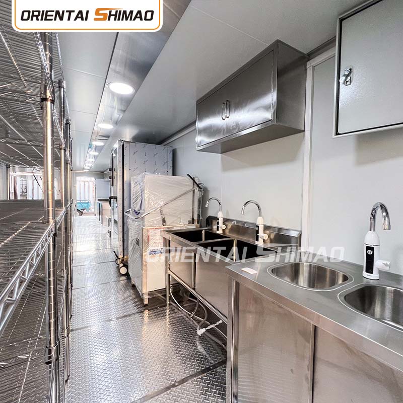 インテリアレイアウト: スペースを最大限に活用するために、キッチン、ダイニングルーム、収納エリア、その他のエリアを合理的に計画します。同時に、ビジネスニーズに応じて、生産エリア、暖房エリア、販売エリアなどのさまざまな機能エリアが設定され、運用が容易になり、運用効率が向上します。