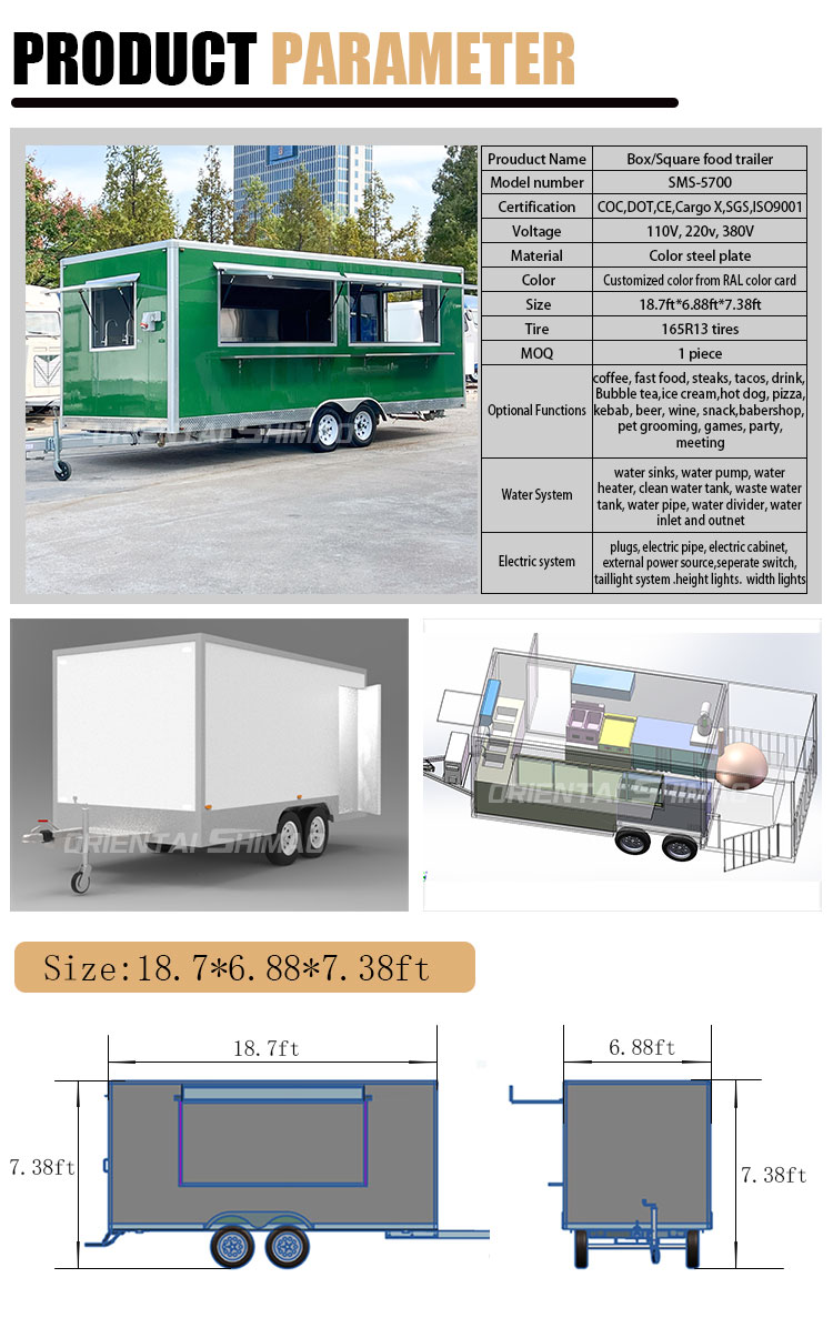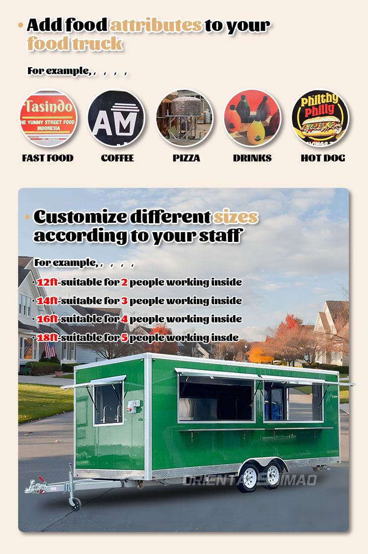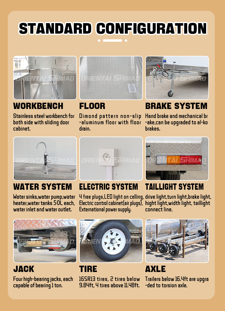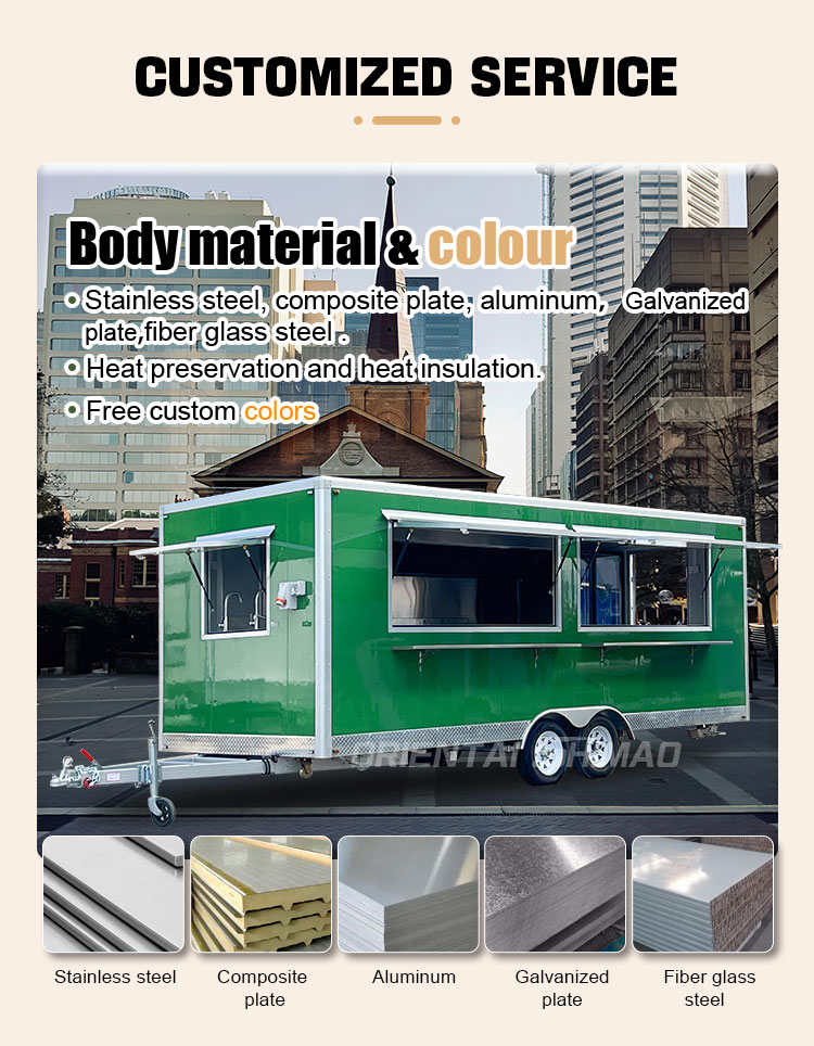 素材とプロセス:フードトラックの外観が美しく耐久性のあることを保証するために、高品質の素材と高度な製造プロセスを選択してください。