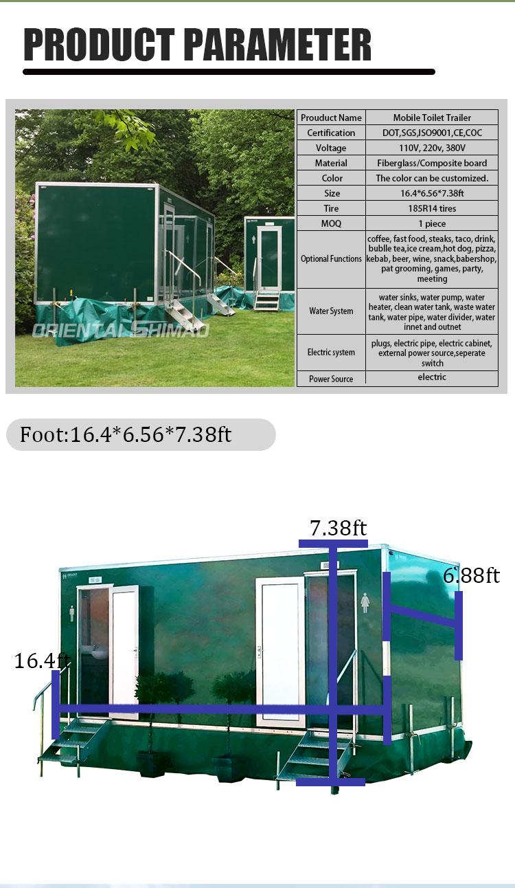 オリエンタルシマオデラックスエコフレンドリーモバイルパブリックトイレは、あらゆる種類の大規模イベント、建設現場、屋外キャンプ、緊急救助サイトのハイエンドニーズを満たすために設計されたポータブルトイレソリューションです。高度な環境技術とユーザーフレンドリーなデザインを組み合わせることで、この衛生車両は快適で安全で効率的なトイレ体験を提供し、最新の一時的な衛生施設に最適な選択肢となります。