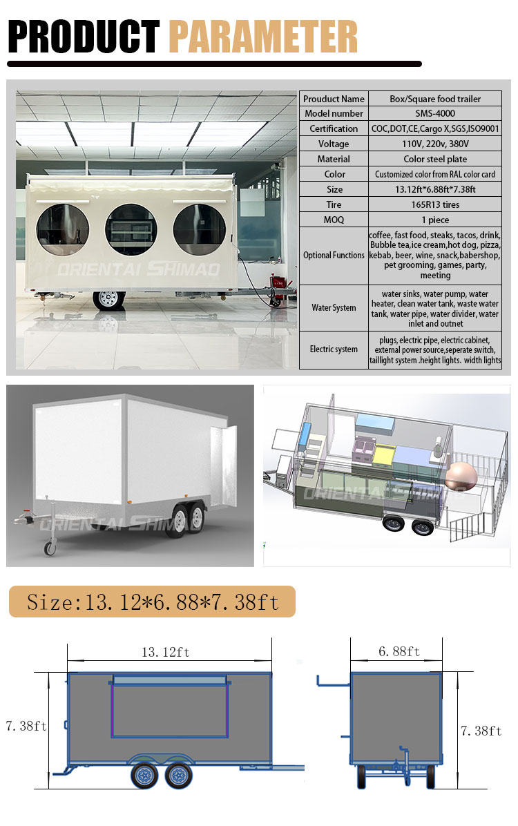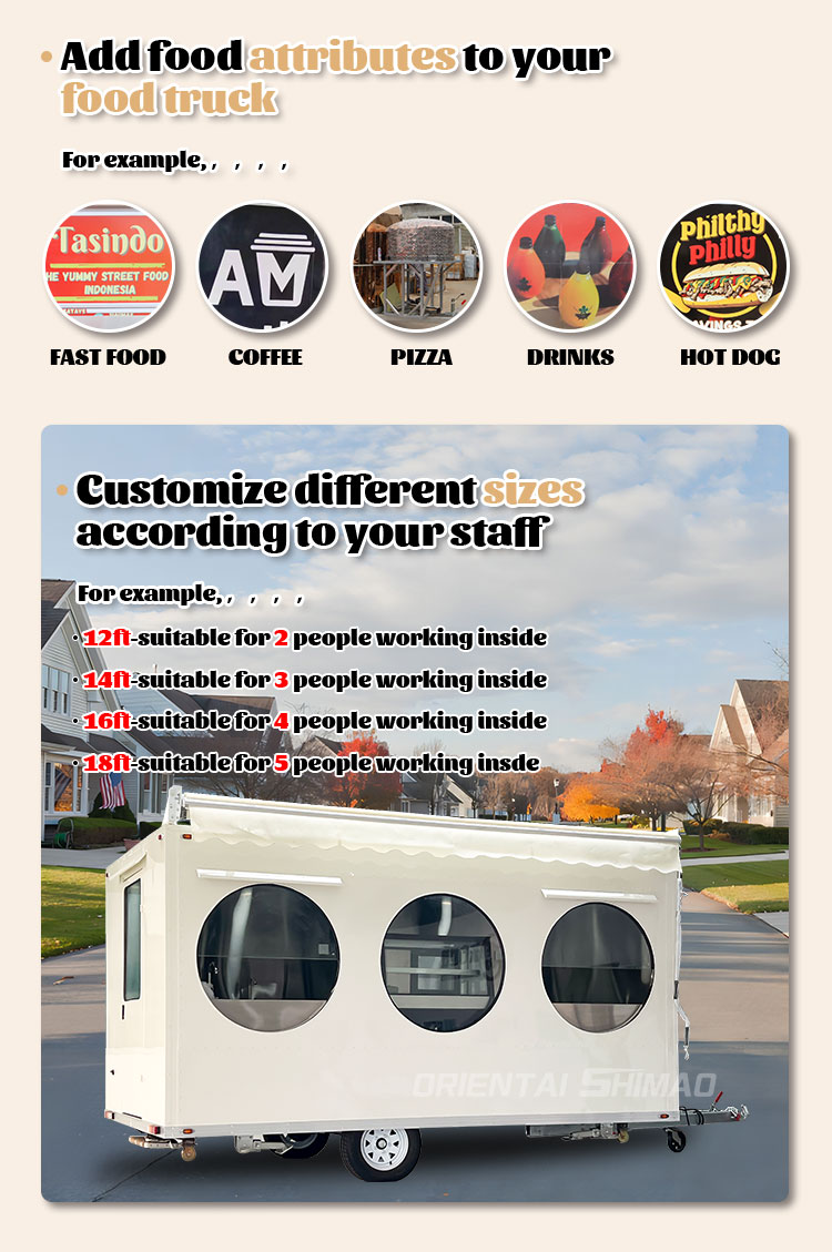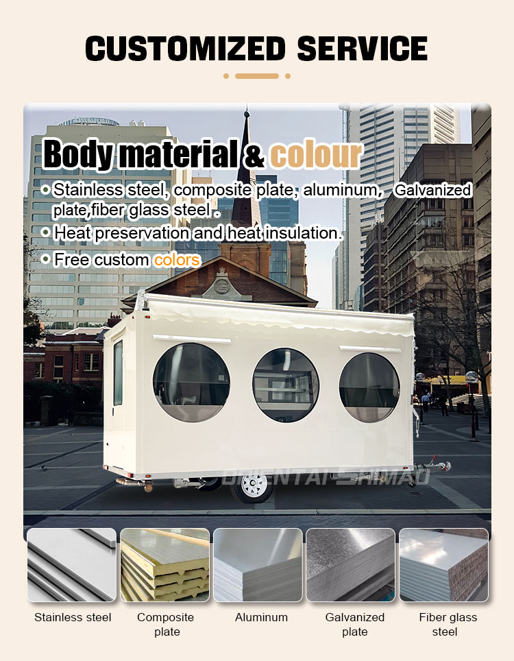 素材とプロセス:フードトラックの外観が美しく耐久性があることを保証するために、高品質の素材と高度な製造プロセスを選択してください。
