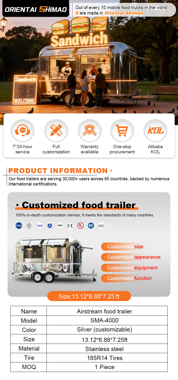 主材料には、耐食性と耐久性に優れ、さまざまな環境条件下でも安定した性能を維持できる高品質の304ステンレス鋼を採用し、当社のトレーラーフードトラック製品は、長期にわたって優れた品質と機能を維持し、さまざまな課題に直面することができます。 304 ステンレス鋼の優れた耐食性により、トラックは酸化や錆びの影響を受けにくくなり、耐用年数が大幅に延長されます。 304 ステンレス鋼の優れた耐食性により、トラックは酸化や錆びにくくなり、耐用年数が大幅に延長されます。